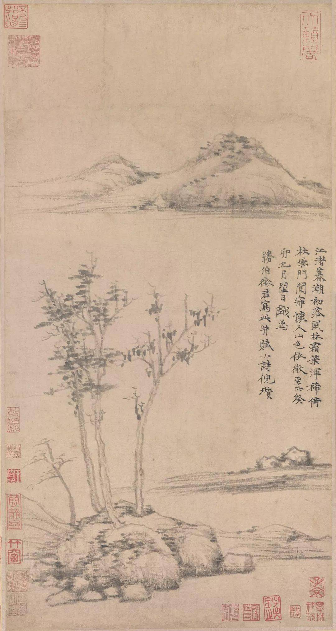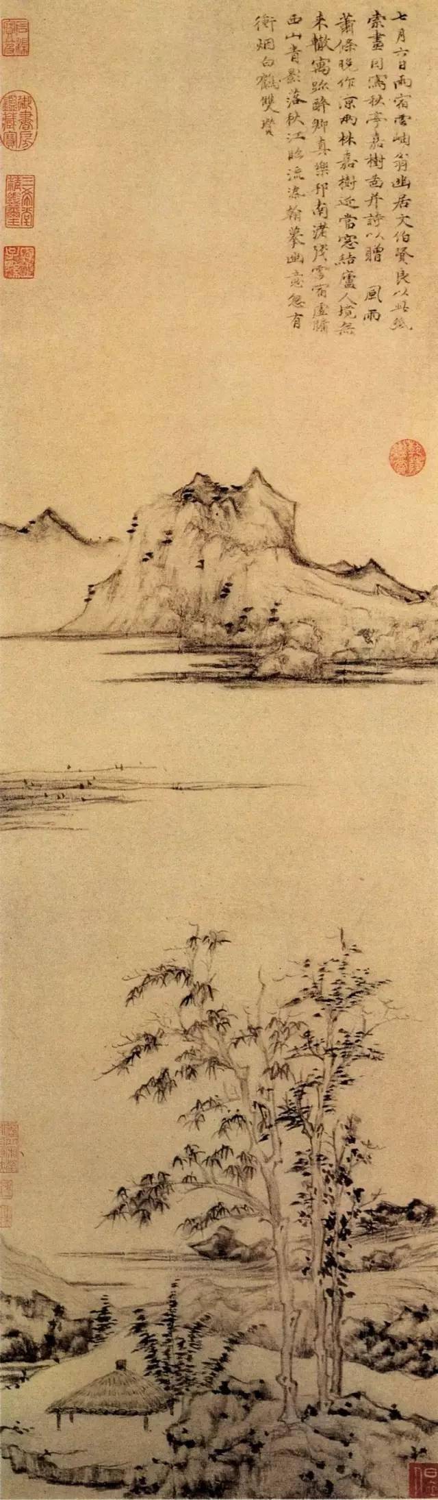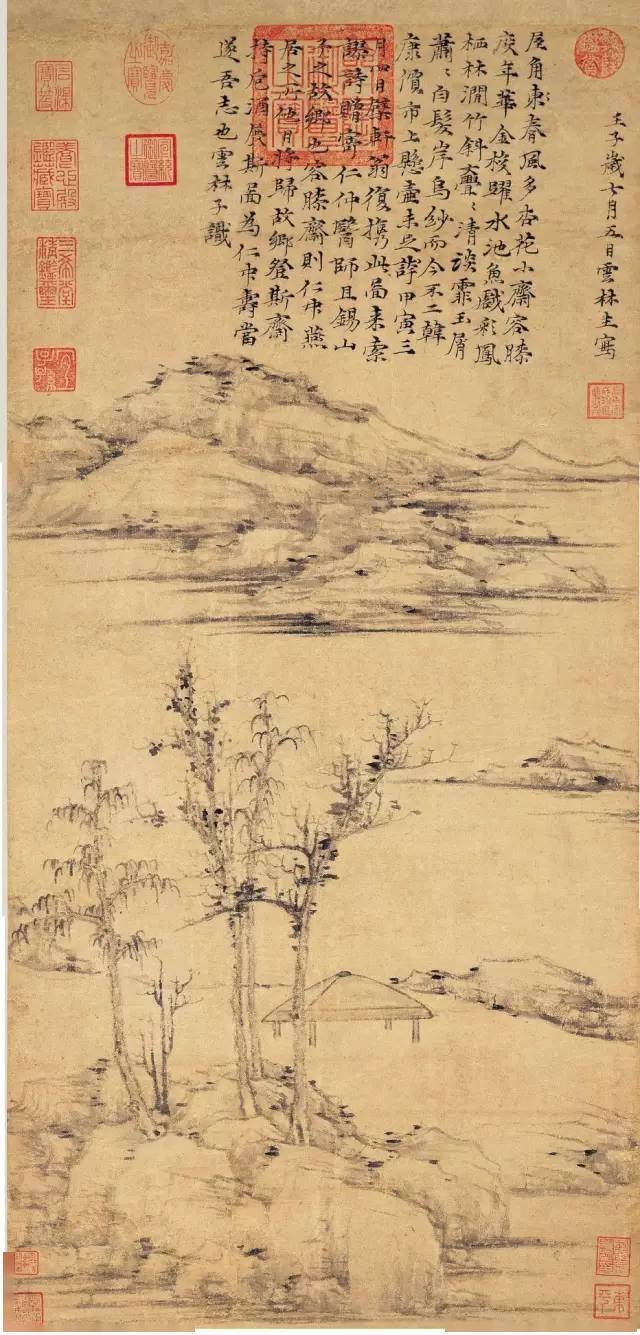 倪瓒 《秋亭嘉树图》 常人觉得过于简单, 甚至有些单调乏味了。 但在懂得了他的洁癖之后, 再来看他的画, 方能体味到他笔墨简练之意境。