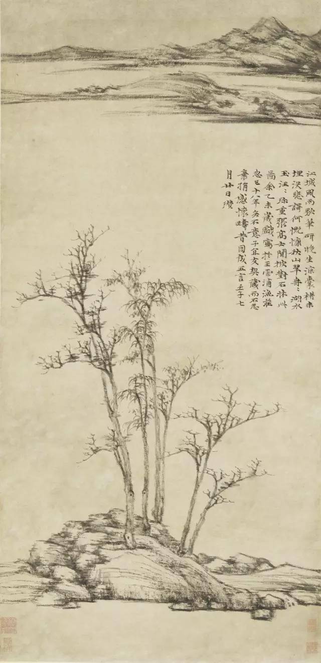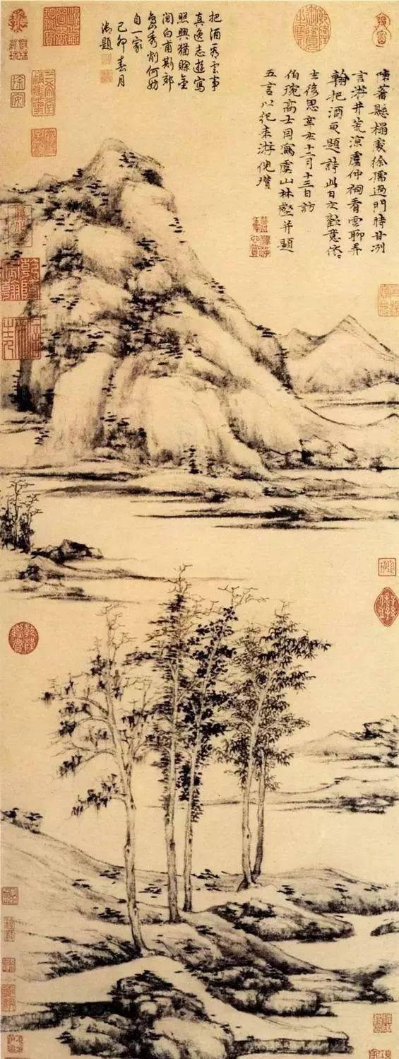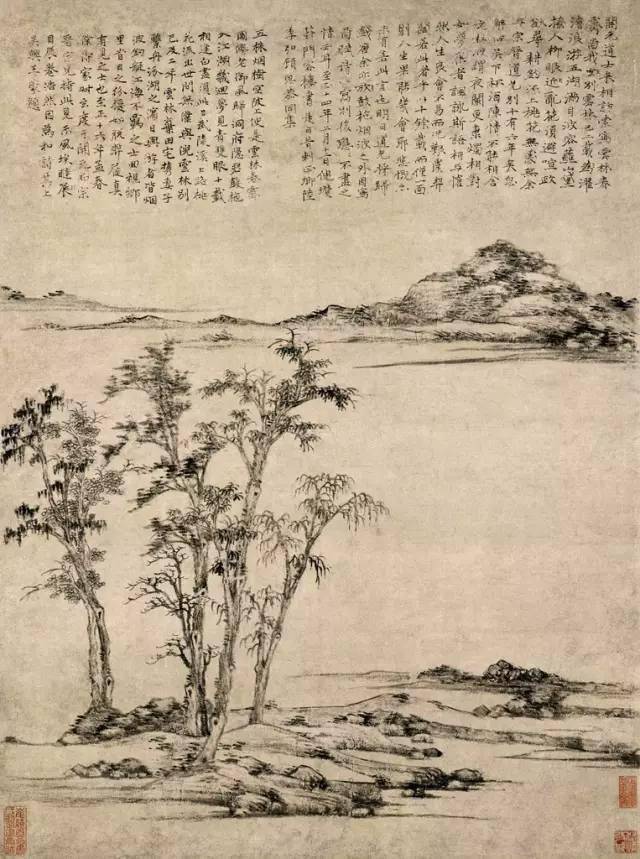明 沈周 仿倪瓒山水 这是画史里很有名的一则趣事。 所谓的“过”, 指的是画得重了,实了,多了。 “又过矣!”, 说明沈周是一直努力要学得像的, 无奈天性厚重,“力胜于韵”, 一下笔就“过了”。 因此他自己也感叹: “苦忆云林子,风流不可追。”