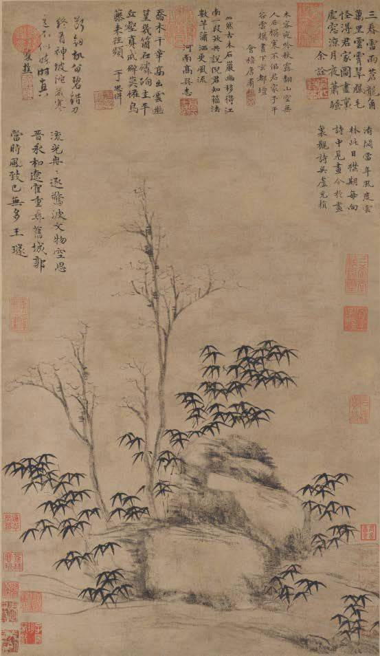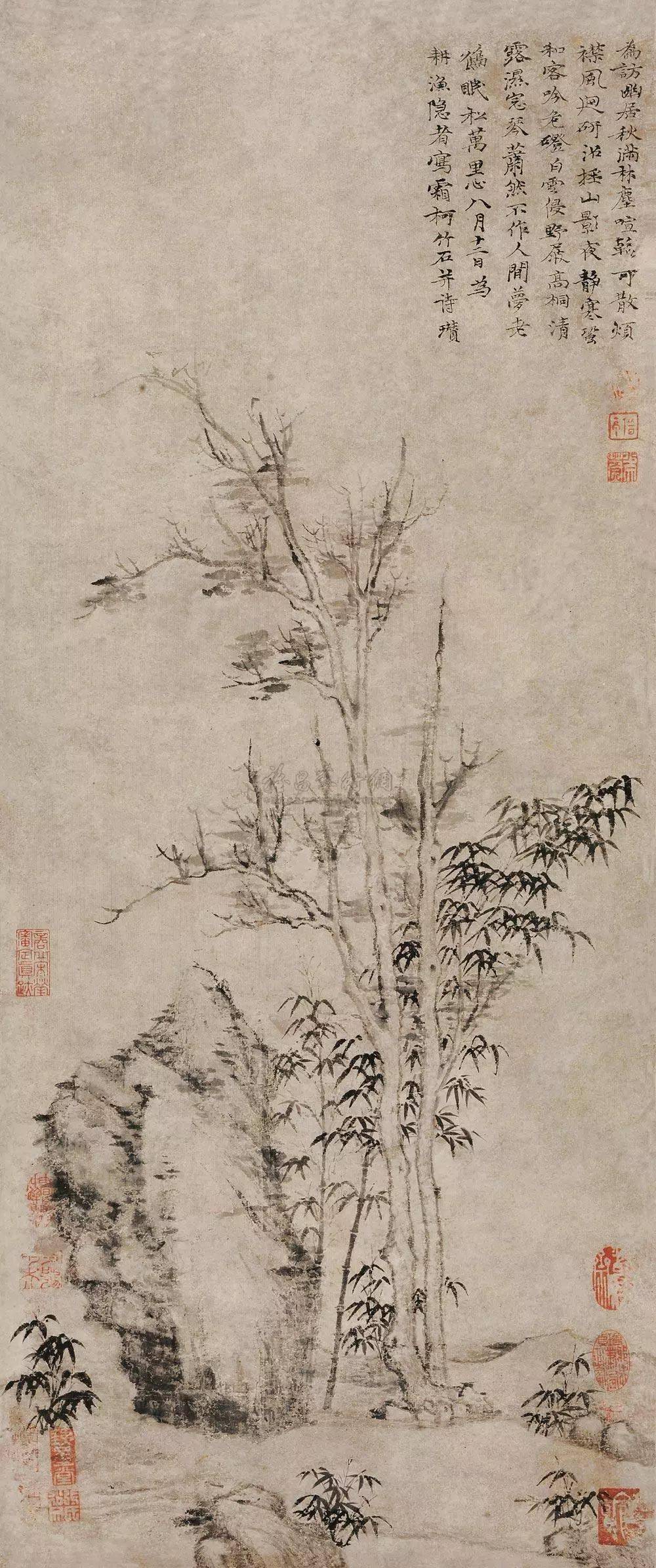 倪瓒 《霜柯竹石图》 在中国艺术最幽微的处所, 有一个水不流、花不开的世界, 一个近于不动的寂寥宇宙。 这里没有色彩,没有人烟,没有喧闹, 甚至没有一块绿叶, 没有一片游云……