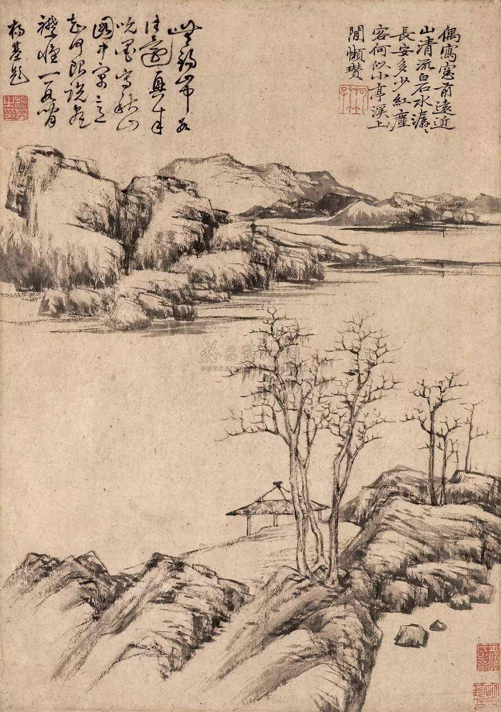 清 恽寿平 仿倪瓒山水 恽南田的花鸟活色生香, 可是他最欣赏倪瓒的“真寂寞”之境, 他说云林的画 “真寂寞之境,再着一点便俗。”