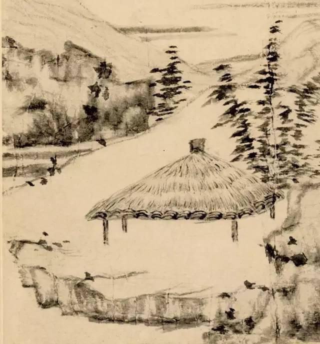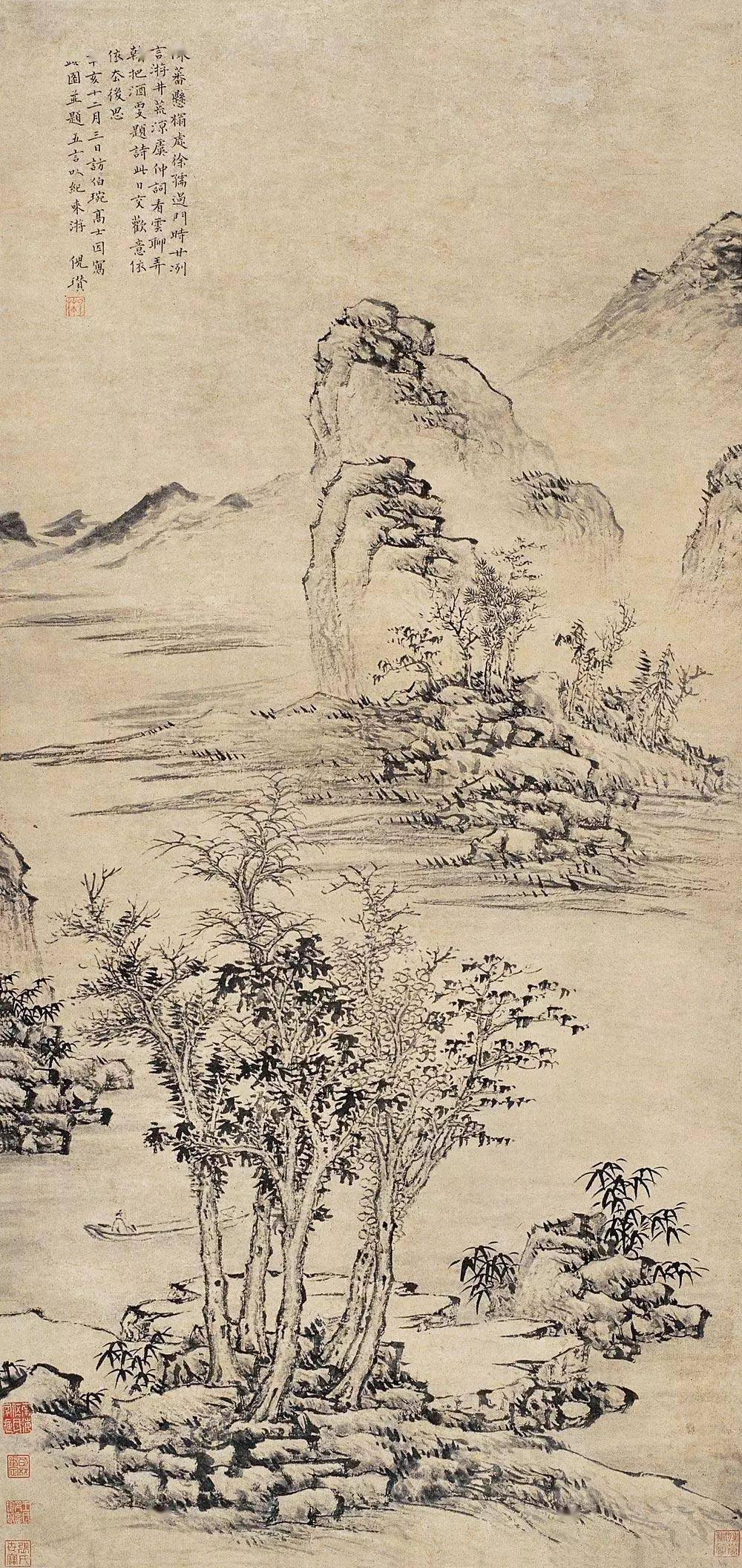 倪瓒 《溪山访友图》 可再细看, 却发现他的笔上似乎有霜色, 一木一石经他的笔一扫, 全都染上幽冷高寒。