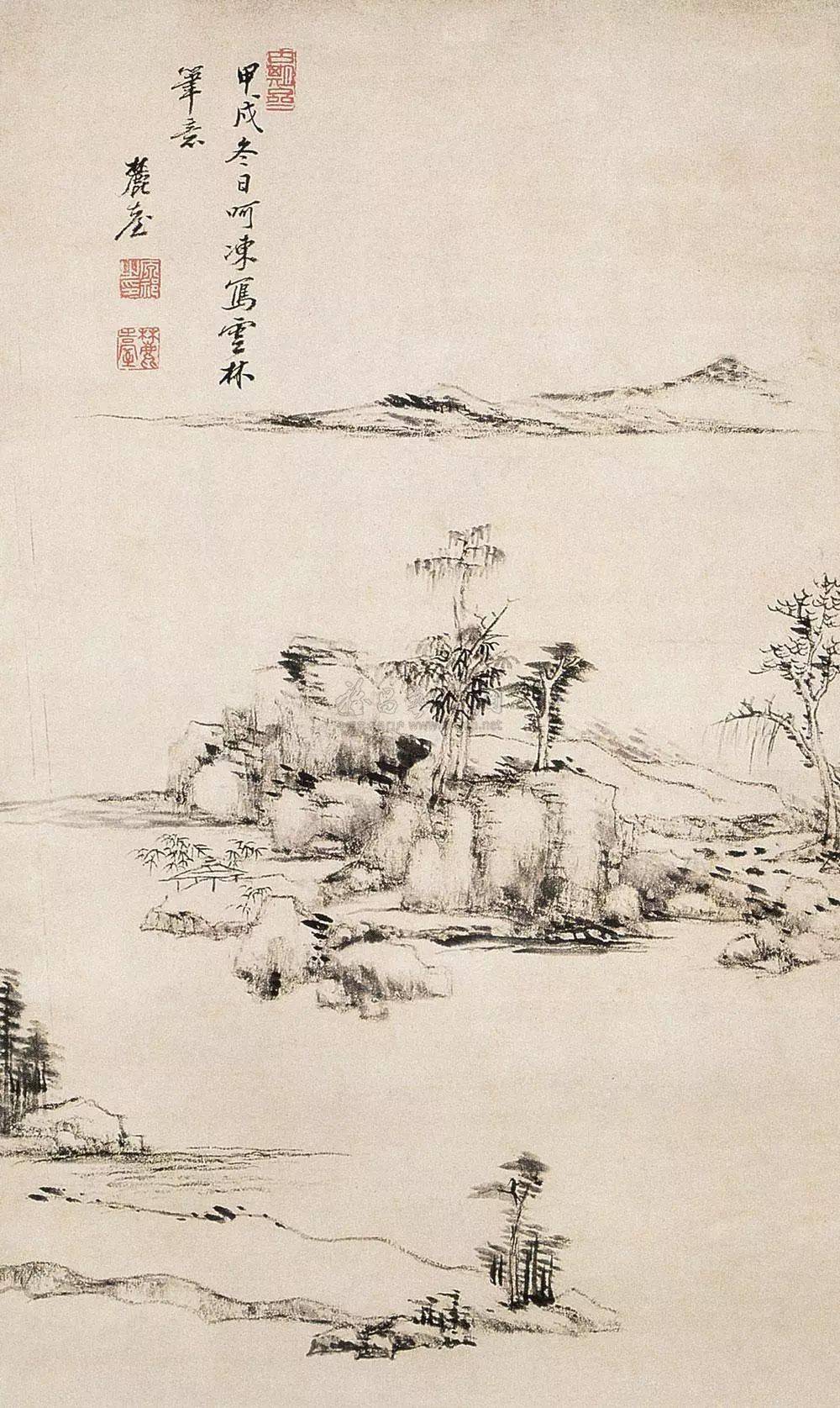 清 王原祁 仿倪瓒山水 要说气韵格调最靠近云林的, 可以找出两个人, 恽寿平是一个,渐江是一个, 然而前者偏于弱,后者偏于硬。