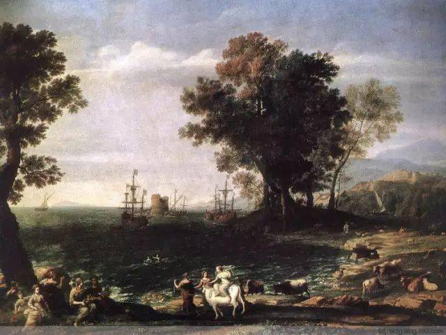 《欧罗巴》 洛兰这位得天独厚的法国风景画家,自从被法王路易十四命为凡尔赛宫作画以后,连他的画室也成了欧洲名流们光顾的场所了。洛兰的平步青云确乎是他的人生一大侥幸。他的财富也随着荣誉而来,当时他的画的要价,开口便是百金。据为他作传记的德国画家兼雕刻家桑德拉尔的回忆:尽管洛兰连签名也不会,笔体笨拙,一时一个样, 一看便知是个文化不高的人,但面对这种突然的富贵机运,他没有改变自己的生活方式。他一直同两个从洛林家乡接来的侄儿生活在一起。1651年,他收养了一个名叫阿涅丝的私生子作为他的女儿。死后在留下的遗嘱中,也没有忘掉他的侄儿、他的家庭以及教区附近的知亲好友。作为一个出身贫寒的艺术家,始终能保持善良朴素的品质,也为后人所传诵。 他的那些带典故的风景画,都是在个人风格成熟时期所创作的,而且画面越来越充满舞台般的戏剧性特征。比如他于1648年取自圣经题材的一幅《以撒与利百加的婚礼》(也称《磨坊》,现藏伦敦国立画廊)。1647年的一幅题材取自罗马神话的《奥德修斯将克律塞伊斯送还她的父亲》(现藏巴黎卢浮宫)等,就是这一时期的画例。 这里的一幅《欧罗巴》,创作日期较晚,画风虽属于这一时期,而完成时已在他的晚年了。 风景展现在一个海湾附近,除了旷野与海滩外,没有任何建筑物,仅海口处有一古时残留的碉堡,海上有数艘清晰可见的帆船。这种景色和洛兰的其他风景画相似。理想化成分较多。神话欧罗巴被劫的故事就发生在这一块美丽如画的海滩旁的中景上。这里有几头被放牧的牛,欧罗巴与一群少女好奇地围住一头白牛,欧罗巴已坐到牛背上。左边树丛里有几个牧人在弹琴休憩。人物依然画得很小,在整个风景中不甚显目,至多是一种点缀而已,油画的主调仍是自然景色的抒情因素。 欧罗巴是神话中所说的、腓尼基王阿革诺耳的女儿,一次与其姐妹卡德摩斯等人去野外郊游,见到一头美丽的白牛,她便好奇地骑上这头白牛背上。岂知白牛是天神宙斯的化身,因见欧罗巴美丽,才变成白牛诓她到牛背上,并把她劫持到克里特岛, 最后与她生下了弥诺斯。这幅画在光色技法上有特殊的表现意义。他的光色处理一直是后人崇敬的技法,英国风景画大师透纳就非常钦慕他。所以间接地看洛兰的画风,他还是法国印象主义在光色画法上的先驱者。