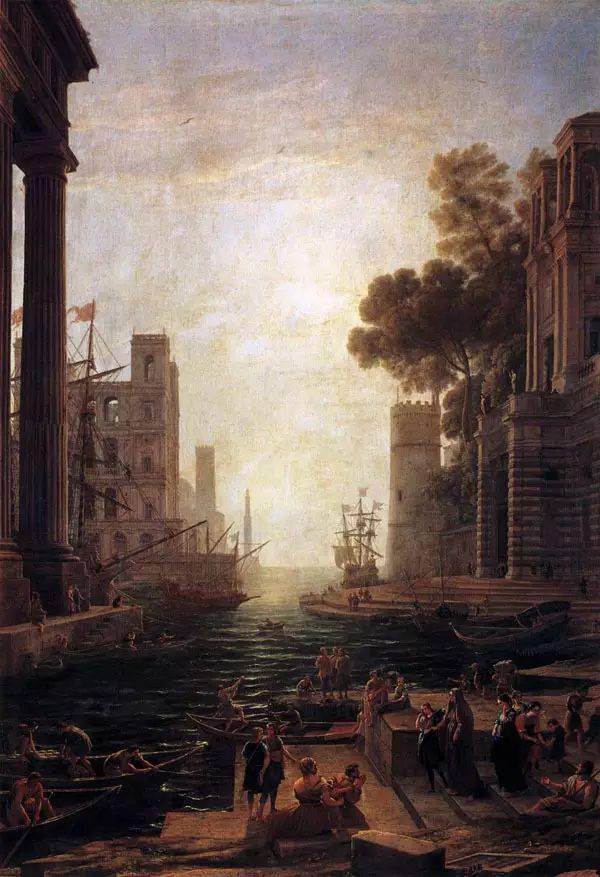 《希巴王国皇后乘船的海港》 克劳德·洛兰在意大利度过平静的一生,其画同其人一样平和明朗。他的风景画创作由初期的讲究传统迅即转入极富活力的北欧风格。由于他久居罗马没有为法国学院画风浸染,使他的风景画能与普桑的作品一脉相承。他革新古典风景画,把自然景观与人文思想相结合,开创了以表现大自然的诗情画意为主的新风格。他的作品充分显示了画家对光线的高度敏感,加之注入人物细腻的描绘,使中年时期的画风到达澄净与和谐的境界;晚年则更有个性,物体造型刻意拉长,色彩带有银色光芒,流露出神秘且严肃的气氛。他的风景画中开阔的海平线总给天空留出巨大位置,近景则总是带有罗马式建筑、船只、人物的逆光海滨。 《克娄巴特拉在塔尔斯登岸》、《乌利西斯将克莉赛斯交还其父》、《圣保罗登舟》等都以海空一色,宁静优美的画面令人赏心悦目。