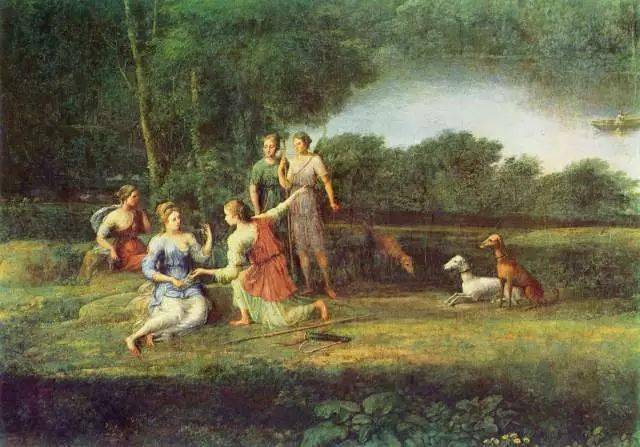 《有舞者的风景》 这件作品是克洛德.洛兰的一件著名的风景画作品,这件作品以风景为中心,人物只是点缀。画面地平线压得很低,从天际放射出光芒,河水滋养着农田,两岸古木参天,背光处浓阴馥郁,芳草留香,在天空逆光的照射下,更衬托出天水的光明。休息的农人们在河岸上欢快地舞蹈嬉戏,这些点缀性的人物,使画面深远辽阔。由于舞者的欢乐而使宁静的大自然充满生命的活力,实在是一首田园抒情诗篇。虽然洛兰与普桑一样,在风景画中常常借助于一些历史的、神话的和宗教的题材,但是他比普桑更进一步地把这些题材置于次要地位。