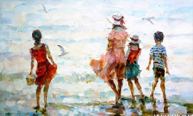 油画《海边戏水》