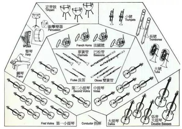 钢琴:普遍用于独奏、重奏、伴奏等演出,用于作曲和排练音乐十分方便。 管风琴:是一种键盘乐器,也是世界最大的乐器,外形类似直立式钢琴,通过脚下的踏板送风,吹响音管,并配合双手键盘弹奏。 一个乐队的成员分布 一个完整的交响乐团拥有75至90名成员,如此多的乐器和演奏者并不是杂乱无序的分布,而是十分有讲究的。