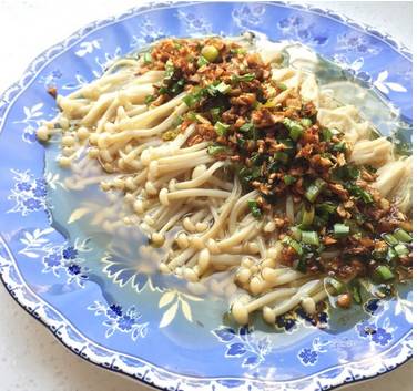 用料:金针菇、蒜、色拉油、盐、鲜味生抽、麻油、葱花糖