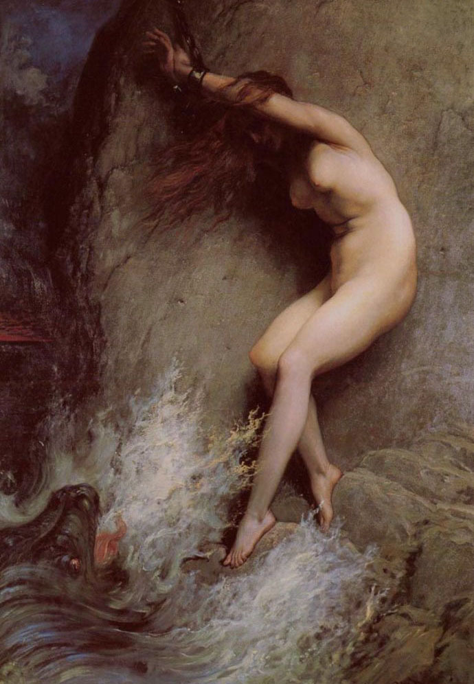 在多雷的这幅画中,公主安德洛墨达被锁链绑在岩石上,紧靠山岩孤立无援。海怪血盆大口张着就在公主脚边,深褐色岩石背景坚硬如铁,绝望又无处可藏。