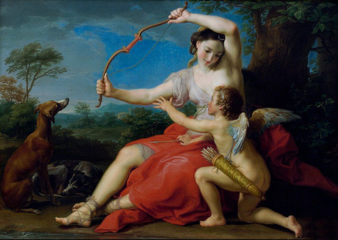 巴托尼的这幅作品中,展现黛安娜拿走丘比特的弓箭,在争斗玩耍中。画中黛安娜娇艳无比,红色的裙子醒目靓丽。丘比特五彩翅膀和关注争执的狗也是亮点。