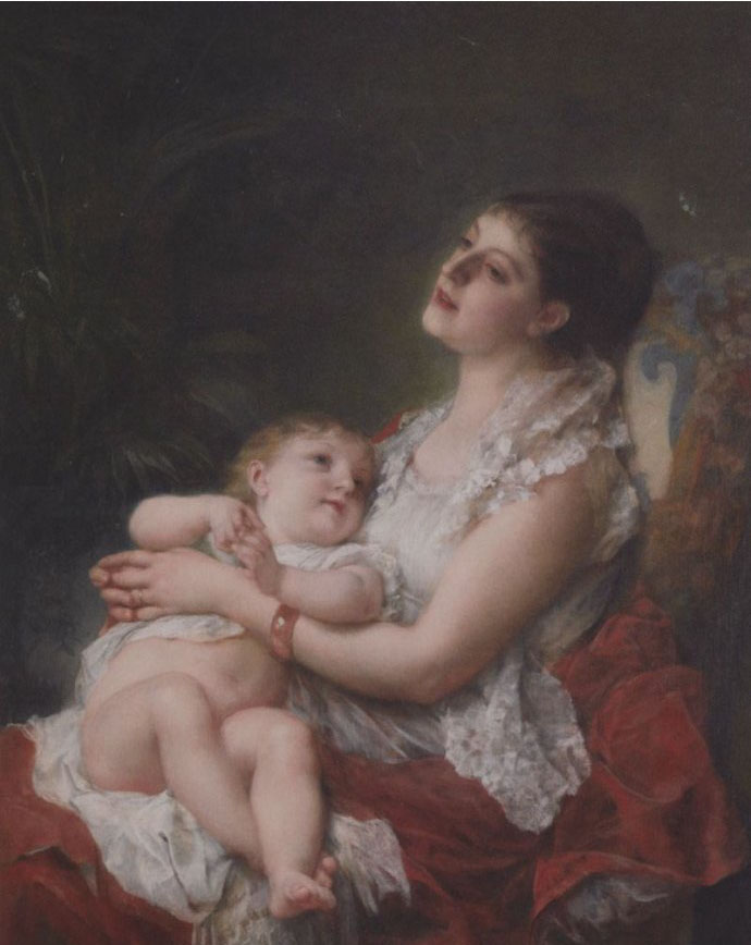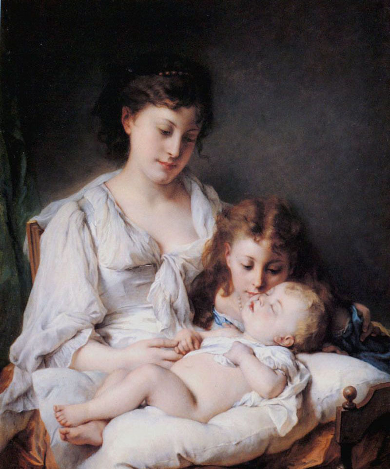 从题材来说,这是人间最普通的生活场景。母亲怀里的孩子甜甜地睡着,一个小姐姐模样的女孩亲吻这个孩子。画家笔下熟睡的孩子被绘制的非常开爱,两个短短的 手臂曲卷着,肥肥的小脚丫和鼓鼓的小肚皮占据了这幅画的中心醒目位置,母亲慈祥的目光注视下,母爱主题被渲染得布满整个画卷。