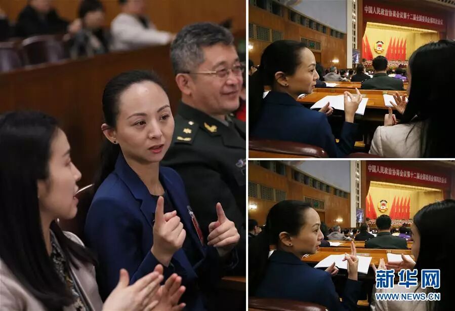 3月3日,中国人民政治协商会议第十二届全国委员会第四次会议在北京人民大会堂开幕。这是全国政协委员邰丽华通过翻译的手语“聆听”会议。 新华社记者 兰红光 摄
