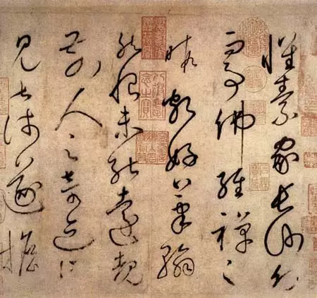 《自叙帖》,纸本墨迹卷,怀素书于公元777年(唐大历十二年)。大草(狂草)书,凡一百二十六行,首六行早损,由宋代苏舜钦补成。《自叙帖》乃怀素草书的巨制,活泼飞动,笔下生风,“心手相师势转奇,诡形怪状翻合宜”,实在是一篇情愫奔腾激荡,“泼墨大写意”般的抒情之作。